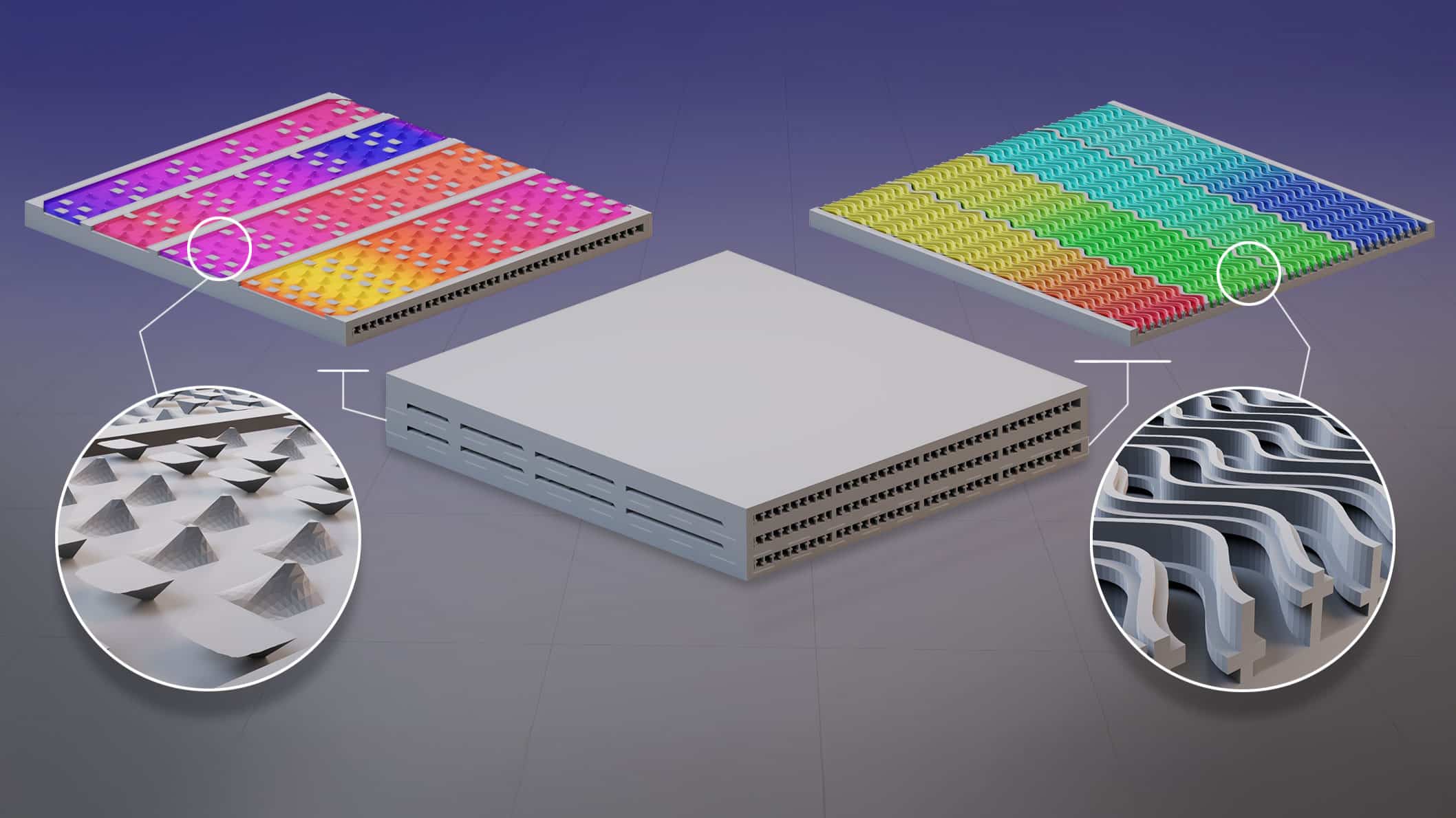 Кинг и его коллеги использовали аддитивное производство (3D-печать) для создания теплообменника со сложной геометрией. В него включили элементы, оптимизирующие движение тепла, такие как волнистые стенки и выступы в форме пирамид. Подобные формы невозможно реализовать при помощи традиционных методов изготовления.